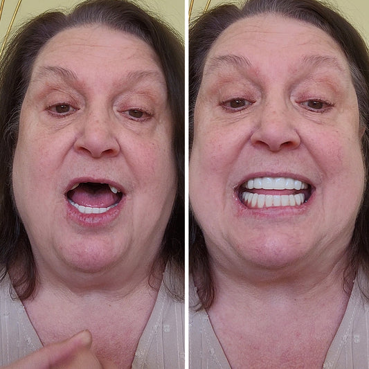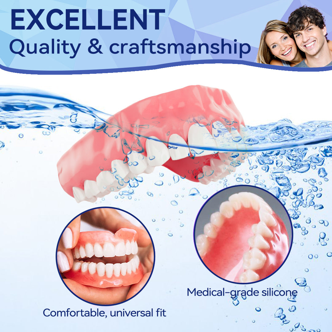 🌟 Лесно поставяне, безшевен комфорт: Насладете се на протези, които пасват перфектно на устата ви от момента, в който ги поставите. Нашият модерен дизайн осигурява плътно и сигурно прилягане и осигурява изключителен комфорт, който се усеща като естествена част от устата ви. Можете да се наслаждавате на деня си с увереност, без дискомфорт или подхлъзване. Можете да се храните, да говорите и да се усмихвате без притеснение.